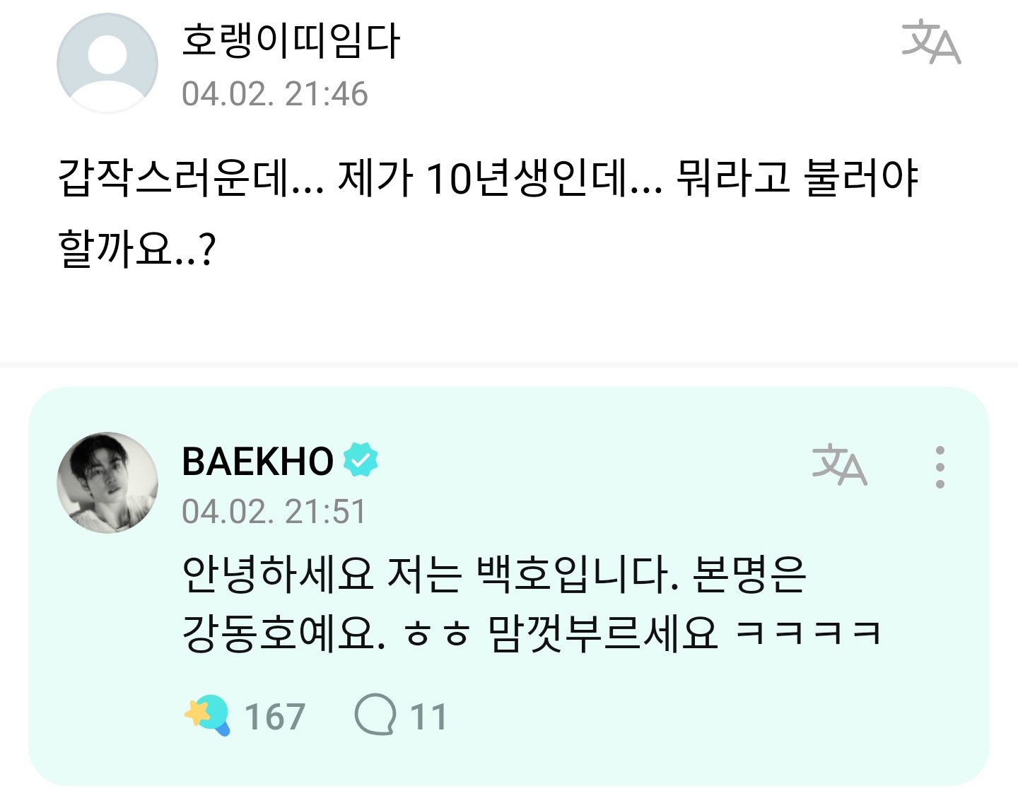 안녕하세요 저는 백호입니다. 본명은 강동호예요. ㅎㅎ 맘껏부르세요 ㅋㅋㅋㅋ