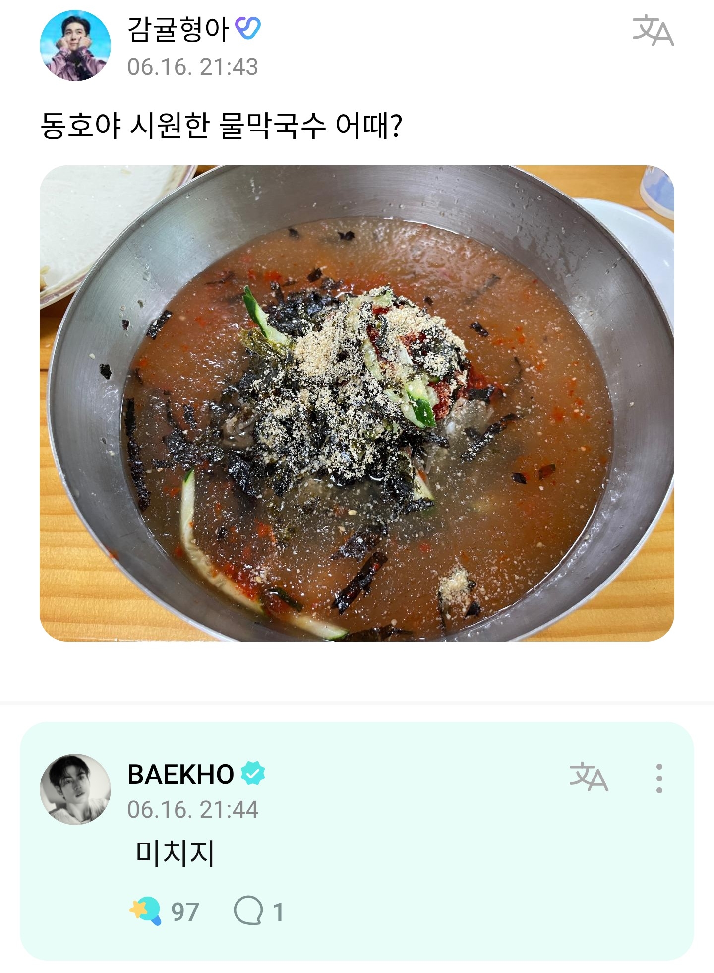 오 내가?? 나 물회에 밥 말아먹는거 좋아하는데?? 어릴때 계속 그렇게 먹었는데….